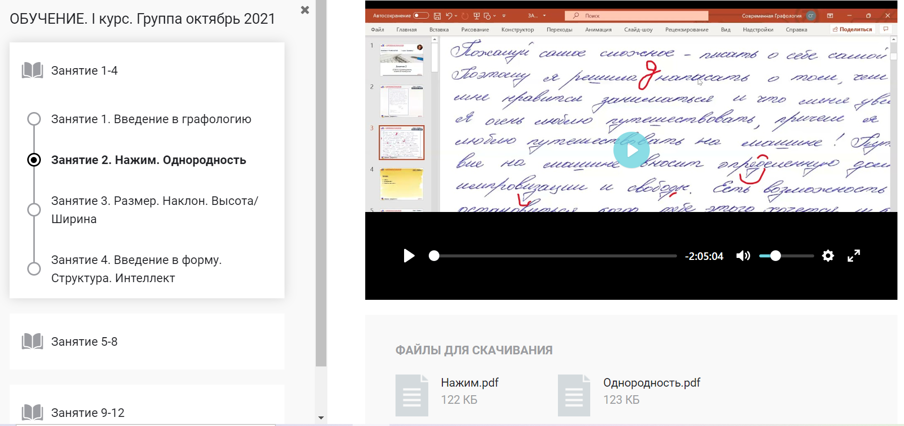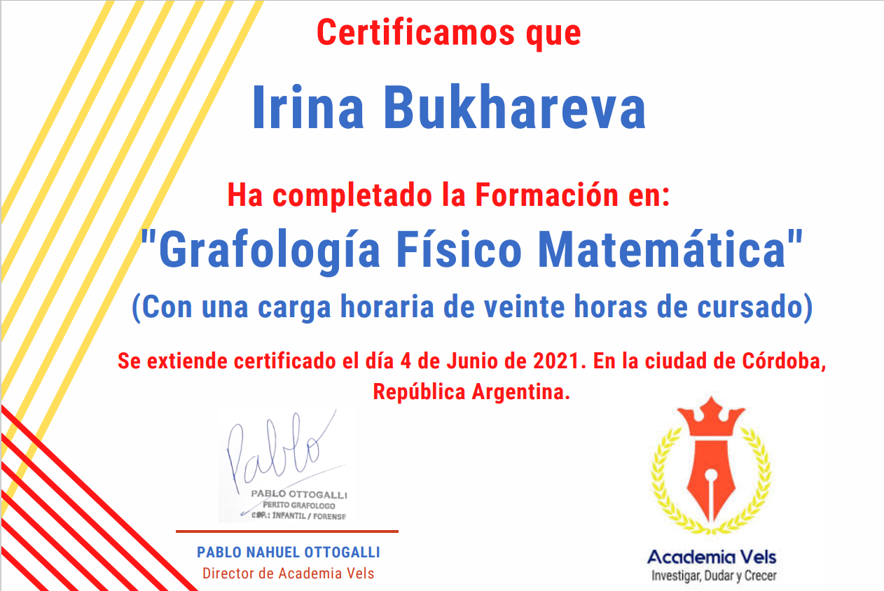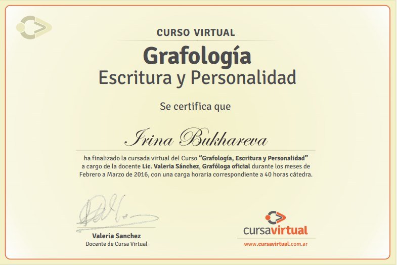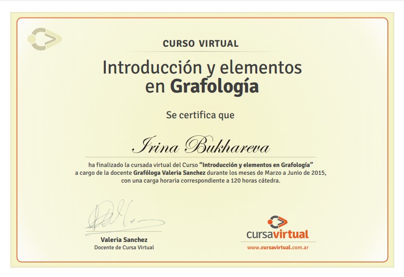 Сейчас я прохожу онлайн-курс по графологическому анализу (1 модуль) на курсе у Ирины Бухаревой. За последнее время это одна из самых содержательных, полезных и актуальных программ в моей практике. Прекрасный преподаватель. Все очень понятно, структурировано, прекрасный баланс теории и практики. Всегда есть возможность задать вопрос, уточнить неясные моменты. Программа очень насыщенная,