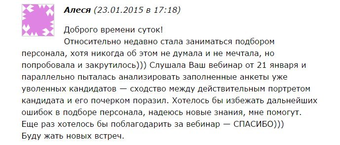 Здравствуйте, Ирина. Меня давно интересовала тема графологии, в то время было мало информации по этому вопросу, и я думала, что это сложно, скучно и времени у меня на это нет. Послушав вас, я изменила свое мнение и интерес к графологии возродился. Вы светлый и легкий человек, такое впечатление у меня сложилось во время прослушивания вашего вебинара. Чувствовался