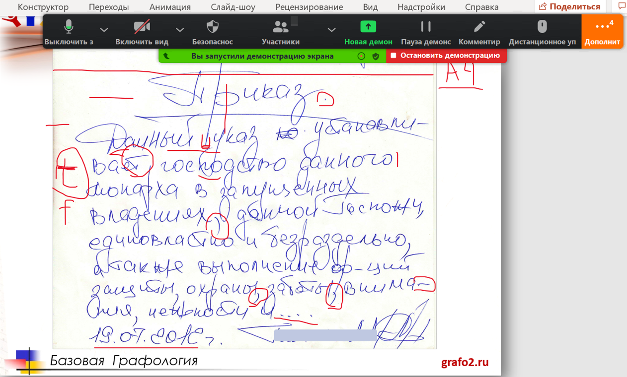 почерка и подписи. А на вебинаре я сама выступила в роли учащейся, под чутким руководством Ирины узнав для себя много нового и интересного. Было продуктивно отойти от криминального аспекта графологии к общесоциальному. Ирина, огромное Вам спасибо! Вы истинный профессионал и мастер своего дела! Предлагаю дружить.